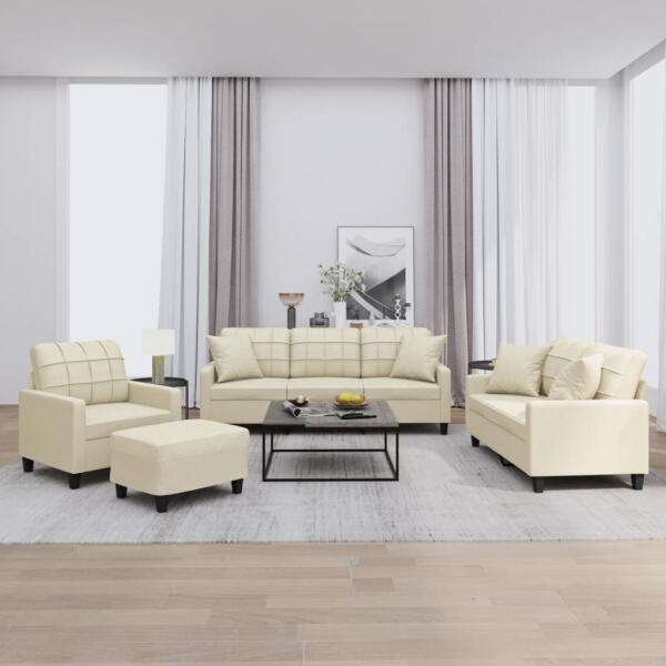 vidaXL 4 részes krémszínű műbőr ülőgarnitúra párnákkal Ez az ülőgarnitúra kiváló hely a beszélgetéshez, olvasáshoz, tévézéshez vagy akár pihenéshez. Célja, hogy otthona fókuszpontja lesz. Tartós műbőr: A prémium minőségű műbőr rendkívül tartós anyag. Foltálló, így nedves ruhával könnyen tisztítható. A sima felület fényűző megjelenésű, és a valódi bőr szépségét biztosítja. Erős és stabil váz: A kanapé ülőfelületének furnérlemez és fém váza biztosítja a szilárdságot és a stabilitást. Kényelmes ülésélmény: A kanapé rendkívül kényelmes a vastagon párnázott üléseknek, karfáknak és hátpárnáknak köszönhetően. Praktikus kanapépárnák: Ezek a négyzet alakú díszpárnák nem csak otthonát dobják fel, de extra kényelmet is nyújtanak ülés vagy fekvés közben. Rugalmas lábtartó: A lábtartón megpihentetheti lábait, amikor hátradől a kanapén, de további ülőhelyként is szolgálhat a szobában. Egyszerű kialakítása és kompakt mérete miatt szinte bármelyik helyiségbe ideális választás. Színe: krémszínűAnyaga: műbőr (75% polivinil-klorid, 20% poliészter, 5% pamut), fém, textilén, furnérlemezTöltőanyaga: habKanapéfotel:Teljes mérete: 78 x 77 x 80 cm (Szé x Mé x Ma)Ülőfelület szélessége: 60 cmÜlőfelület mélysége: 50 cmÜlőfelület magassága a talajtól: 41 cmKarfa magassága a talajtól: 56,5 cm2 személyes kanapé:Teljes mérete: 138 x 77 x 80 cm (Szé x Mé x Ma)Ülésszélesség: 120 cmHáromszemélyes kanapé:Teljes mérete: 198 x 77 x 80 cm (Szé x Mé x Ma)Ülőfelület szélessége: 180 cmPárnák mérete (egyenként): 40 x 40 cm (Ho x Szé)Lábzsámoly:Teljes mérete: 60 x 50 x 41 cm (Szé x Mé x Ma)Összeszerelést igényel: igenA szállítmány tartalma:1 db kanapéfotel1 db 2 személyes kanapé1 db háromszemélyes kanapé1 db lábtartó4 db díszpárna6 db párna